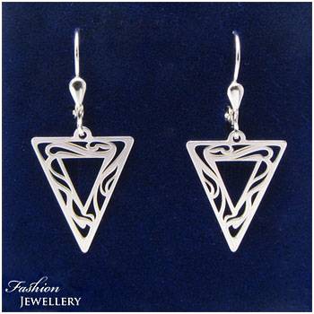 Elegantní stříbrné visací náušnice tvaru trojúhelníků jsou opatřeny prořezávaným vzorem a také leskle vyleštěny. Pro uchycení stříbrných náušnic bylo použito praktické a mezi ženami oblíbené zapínání na patentovou klapku.
